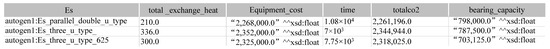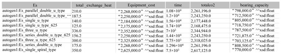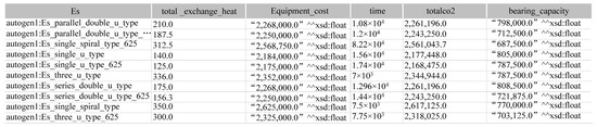 Firstly, the designers can query the significant indicators for the holistic performance of the EPS, corresponding to different building characteristics and cooling/heating requirements. R.1 in Table 4 illustrates how the designer uses the SQWRL rules to query the equipment, which costs less than 0.4 million (USD), to build an EPS. Figure 11 demonstrates the execution and results of querying R.1 in Table 4 related to the filtered design solutions, of which the equipment cost is less than 0.4 million (USD) for building an EPS. Figure 12 shows the execution and results of querying R.2 in Table 4, with regard to the filtered design solutions, of which the bearing capacity is greater than 7 × 106 kN for building an EPS. Figure 13 shows the execution and results of querying R.3 in Table 4, corresponding to the three filtered design solutions with the equipment cost less than 0.4 million USD and total exchanged heat greater than 200 kW.