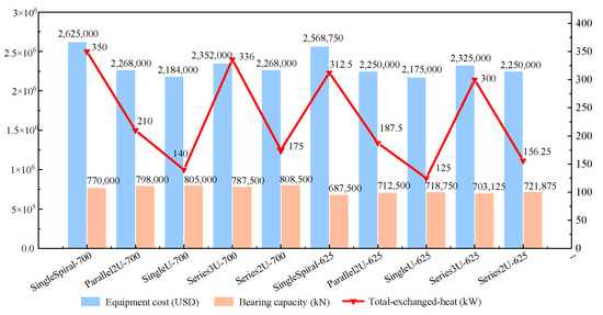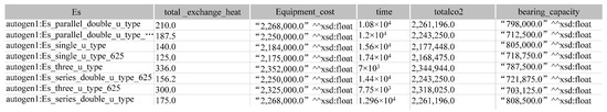 From Figure 11, the calculated cost recovery periods of the eight design solutions are less than the design life (i.e., 20~30 years) of EPS. Among the filtered design solutions, the one with a single U type heat exchanger has the lowest cost, from which the designers can also adjust the other parameters for further optimization in a holistic manner. From Figure 12, the calculated bearing capacity of pile groups for nine design solutions satisfies the assumed bearing capacity limit above. In addition, all the calculated values of bearing capacity based on the OntoEPS are of the same order of magnitude, i.e., the corresponding rules of calculation and query are technically reasonable, with respect to existing research [18]. Furthermore, as two significant indicators of the EPS, the peak of the hourly dynamic load of the EPS calculated by software DEST-C, with the certain equipment cost, can be used to query corresponding design solutions. Specifically, it can be noted from Figure 13 that the design solution with parallel double U exchanger and pile layout of 700 piles involves the least cost. It should be noted that the selection of pump type may lead to significant cost differences within the construction of EPS.