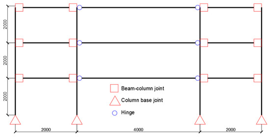 Refs. [13,14] developed studies to investigate the lateral resistance and ductility of portal frames under cyclic loading. These studies expected that portal frames could sustain not only vertical loads but also lateral loads due to wind or/and earthquake loads. The experimental results have indicated that the connections could present a good mechanical performance—in particular, when they are reinforced. Ref. [15] performed an analytical study of timber structures with a moment-resisting joint made up of steel plates, bolts, and steel cotters. The analysis model used for earthquake response analysis is shown in Figure 1, which modeled a three-story timber frame house. The analysis model presented a good agreement with the experimental result, and the structural system clearly showed energy absorption characteristics for earthquake excitation.