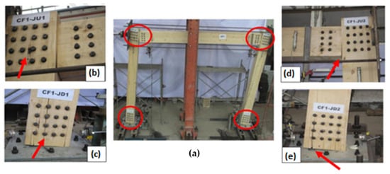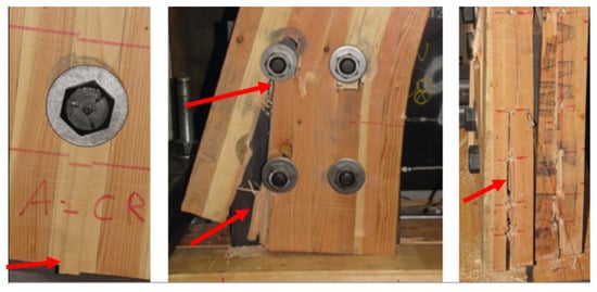 Ref. [30] expanded the studies with self-tapping screws acting as perpendicular-to-grain reinforcement with three different layouts from the ones used in [25] and studied the influence of the bolt diameter and the edge distances of the bolts. Results obtained show that the moment capacity increased by 22.5% when the bolt diameter in the reinforced connection was increased from 19.0 to 25.4 mm. Additionally, a reduction in the bolt edge distances in the reinforced connection provided an additional gain in the moment capacity of 35.3%, leading to a total capacity increase by a factor of 2.9, when compared with the unreinforced connections. However, experimental results under cyclic test demonstrated that the larger bolt diameter could increase maximum moment and elastic stiffness but would reduce the rotation capacity by almost 50%. This also led to a brittle failure mode-like plug shear followed by slight crack development and wood embedment failure (Figure 7).