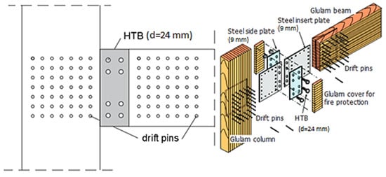In Japan, [24] developed drift-pin joints with insert-type steel plates as a glulam moment-resisting joint. The steel plates were inserted on glulam timber elements and attached with drift-pins. Joints parts were executed in the factory, and assembly was completed on-site by just connecting prefabricated members using several high-tension bolts (HTB) as shown in (Figure 3). This joint offered a better aesthetic outlook, while the glulam cover contributed to better fire performance than the previous connection with nails and steel side plates. However, according to [25], without reinforcements, bolted timber connections with slotted in steel plates have poor ductility and low moment-resisting capacity.