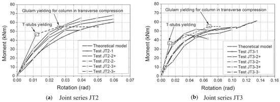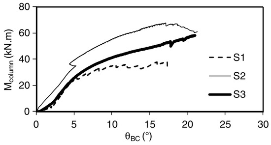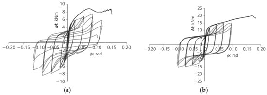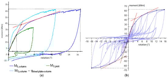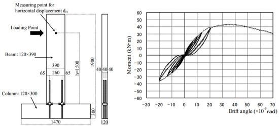 Ref. [15] tested beam–column and column–base joints under cyclic load to obtain the relationship between moment and drift angle. The results of both joints showed low ductile properties after having reached maximum strength (Figure 4).