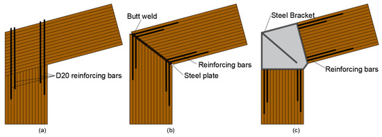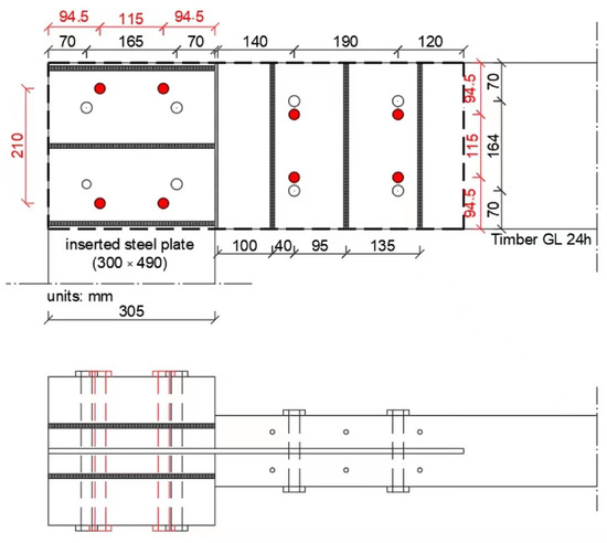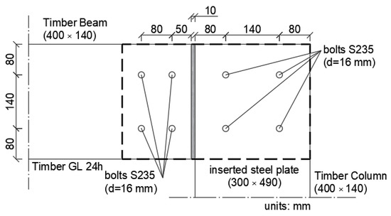 - When the slotted-in steel plate connection is designed without reinforcement, the bending moment is not considered in the design process, and the connection can fail prematurely. In this case, its structural behavior is governed by tension perpendicular to grain and longitudinal shear, which are the properties of timber that have the weakest strength [25,30]. In these cases, to achieve a safe design, slotted-in steel plates should be considered for reinforcement with self-tapping screws (STSs) perpendicular to the grain. Thus, perpendicular-to-grain stresses are transmitted by tensile stresses along the STSs, and the connection capacity is governed by strong tensile strength of the screw’s steel [33].