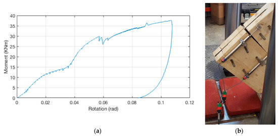 Ref. [32] analyzed the vibration and dynamic response of a semi-rigid moment-resisting beam-to-column dowel-type connection. A timber frame connection (Figure 9) was submitted to a static monotonic test. Glulam of strength class GL24h was used, while fasteners were made of S235 grade and had a diameter of 16 mm. There was a steel plate slotted into the timber elements that was 8 mm thick. The moment–rotation diagram was obtained as a response of the static monotonic load experiment (Figure 9). The test was interrupted because of the cracks on the timber column [32]. The brittle failure was a consequence of the high tension perpendicular to the grain revealed by the column (see Figure 10b).