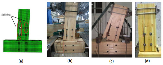 The rotational behavior of typical bolted glulam beam-to-column connections with slotted-in steel plate was also numerically analyzed by [33]. To validate the finite element model, the failure mode and the moment–rotation curves, were compared with experimental results obtained by [25,31,34] (Figure 11). It is important to point out that the failure modes found in the finite element model were similar to the experimental specimens.