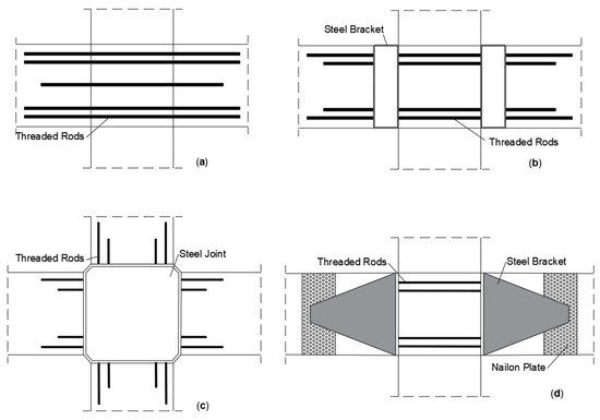 Ref. [43] tested seven types of moment-resisting connections between glulam members using steel bars embedded in the timber parallel to the grain. Three portal frame knee joints and four multi-story beam–column connections were tested. In the Figure 15a a knee joint with epoxied bars passing through the rafter, in Figure 15b a mitred connection with steel bars welded to a steel plate in the mitre and in Figure 15c a joint with a steel bracket connected to reinforcing bars The multi-story connections tested are shown in Figure 16, where Figure 16a presented a threaded rods connection without steel brackets, Figure 16b a connection with box steel brackets, Figure 16c a connection with central steel joint and Figure 16d a connection with lateral steel brackets and nailon plates.
