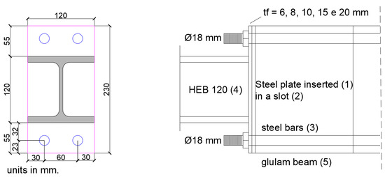 Refs. [53,54] proposed a joint in which a timber element is connected to a steel stub by means of an end-plate and glued-in steel rods (Figure 18). The transmission of the bending moments occurs through the end-plate and steel bars, while the shear occurs through the glued-in steel plate between the timber element and the steel section. Monotonic and cyclic tests were executed over this joint in order to observe the failure modes while measuring the moment resistance and rotation capacity. In this research, a steel profile (4) was connected to a reinforced timber element (5) via end-plate elements. The transfer of the bending moment was assured by the presence of steel bars glued in the timber elements (3), while the shear forces were transmitted by means of a glued steel plate (1) inserted in a central slot grooved at the end of the timber element (2) (Figure 18).