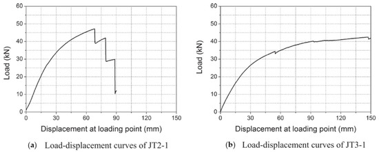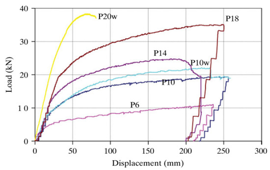 Load–displacement experimental curves for each specimen, (adapted from [53]).