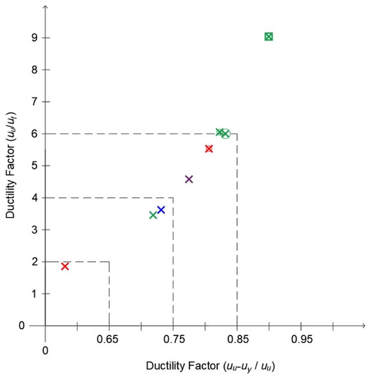 The definition of ductility remains an issue for designers due to the large number of formulae that lead to different results. According to [5], ductility is the ability of a structure to undergo large amplitude cyclic deformations in the inelastic range without a substantial reduction in strength. In timber structures, ductility is mainly achieved through the connections. Eurocode 8 [3] imposes that elements must behave linearly and that all non-linear behavior must be concentrated on the joints. The Swiss code for timber structures, SIA 265 [6], and the European standard EN 12512 [7] defined ductility as the ability of the joint to undergo a large amplitude slip in the plastic range without a substantial reduction in strength. Thus, according to those codes, ductility is measured by a factor between the ultimate deformation and the deformation at yielding. On the other hand, Eurocode 8 [3] defines static ductility as a ratio between the ultimate deformation and the deformation at the end of elastic behavior evaluated in quasi-static cyclic tests. Ref. [8] emphasizes that the method specified in Eurocode 8 [3] is adequate for evaluating the ductility of highly deformable joints or structures. Although much research has used these definitions to measure ductility, there is not a universally accepted definition by the research community. To enable a more accurate assessment of the ductility, Ref. [9] presented 12 different definitions (Equations (1)–(12)). The Equations (1)–(7) are relative definitions, while Equations (8)–(12) are absolute definitions of ductility. Definition Equation (2) is cited in both EN 12512 [7] and in the Swiss timber code for timber structures SIA265 [6].