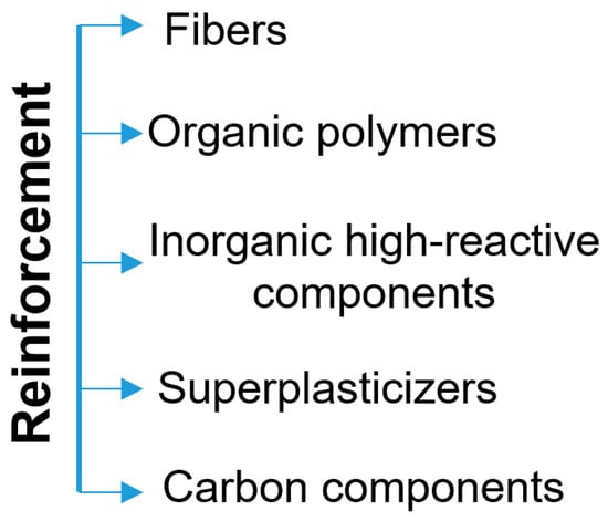 To address this issue, there are various ways to improve the strength performance of geopolymer materials (Figure 1). For example, to increase tensile strength, some authors [13,14] proposed to use fiber elements of different shape, length and chemical compositions to provide reinforcement to a fragile matrix. Another way to strengthen structural geopolymer frameworks is the application of a reinforcing net using a polymer compound, such as epoxy resin, which is introduced into the geopolymer matrix. Such structures are often referred to as hybrid materials [15,16,17,18]. Roviello, G et al. [19] demonstrated a method for the production of hybrid composites based on geopolymer and epoxy-melamine resins with a high degree of compatibility between the organic and inorganic constituents. This was realized using a method based on the synthesis of a joint network of polymer and geopolymer phases in a liquid state due to the interpenetration of the resin into the inorganic matrix at the nanoscale level. Through the use of a hybrid framework, the resulting geopolymer composites had higher mechanical characteristics vs. unmodified composites. At the same time, heat resistance and fire resistance performance remained the same as for geopolymers without modification.