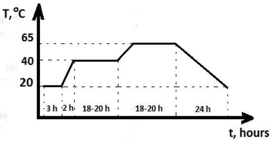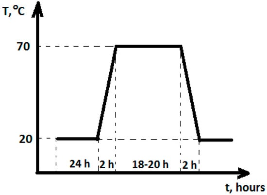 - Natural curing in laboratory conditions at temperature 22 ± 3 °C and relative humidity ≈ 16% for 24 h, followed by heat treatment in an oven according to the following temperature regime: heating to 70 °C—2 h → isothermal curing at 70 °C—18–20 h → cooling to a temperature of 22 ± 3 °C—2 h → natural laboratory conditions until testing (Figure 2).