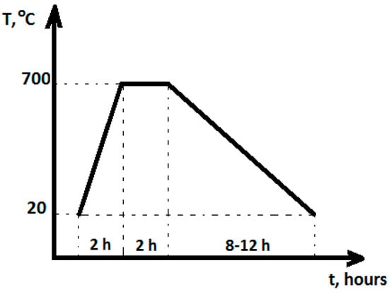 Class F fly ash product produced in Russia was used as the main aluminosilicate component. The Type F fly ash used in this study is a by-product of the combustion of bituminous coal in the form of a wet furnace mass in a circulating fluidized bed. Furnace mass consists of crushed coal particles up to 30 mm. Portland cement CEM I 42.5 (Russia), kaolinite (Russia) as well as metakaolin were used as mineral modifying components (MMC) for synthesis of cellular geopolymers (CGP). Metakaolin was synthesized in laboratory conditions by dihydroxylation of natural kaolin in a muffle furnace according to the following regime: elevation of temperature up to 700 °C for 2 h → curing at 700 °C for 2 h → slow cooling down to 22 ± 3 °C for 8–12 h (Figure 3).