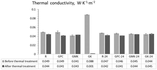 Additionally, the study [38] describes low reactivity of kaolin with the ratio SiO2/Al2O3 = 1.7, which confirms the results of the current article. The introduction method of alkaline activator and high-temperature treatment showed reduction effects of the thermal conductivity coefficient (TCC) of the mix R-24 vs. R up to 4% and 10%, respectively. In case of the mix GMK-24 vs. GMK, the increase of TCC of ≈10% was observed; however, high-thermal treatment resulted in a 2% reduction for GMK-24 and a 5% increase of TTC (Figure 6). At the same time, in the case of the mixes GPC and GK, the introduction method of alkaline activator seems to be very influential parameters to control thermal conductivity response of CGP. For the TCC of these mixes before high-thermal treatment, the values of TCC were 70% and 50% higher in comparison with the GPC-24 and GK-24, respectively. Regarding the effect of high-temperature treatment, the mixes GPC-24 and GK-24 demonstrated a 12% reduction and a 2% increase in the TCC values, respectively. A wide range of deviations of the TCC values among all experimental mixes indicates the relevance of the mineral modifying component used for CGP synthesis.