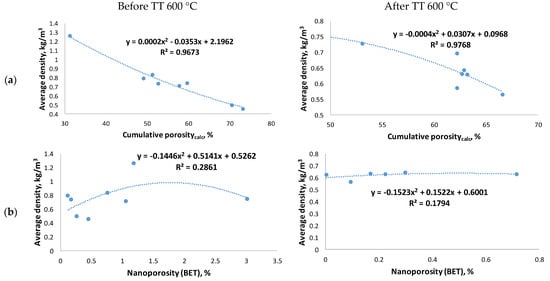 The curves of the dependence of the average density and total porosity in Figure 7 show that the values of the calculated porosity have a high degree of correlation with the average density of the experimental compositions of CGP without high-temperature treatment (R2 = 0.967) and after high-temperature treatment at 600 °C (R2 = 0.969) as well. In both cases, the correlation in the combination “average density—calculated porosity” is best described by a polynomial function. Analyzing the relationship between the average density and nanoporosity measured using the BET method (Figure 7b), it should be noted that the correlation dependence is very low in both cases: without high-temperature treatment and after treatment at 600 °C (R2 = 0.286 and R2 = 0.179, respectively). Probably, such low correlation is not only due to the limited size range of measurements by the Tristar II 3020 analyzer, but also due to the prevalence of closed pores in the studied cellular geopolymer structures, which are not taken into account when using the BET method. Thus, a comparative analysis of the correlation between average density and porosity demonstrated an obvious advantage of using the computational method vs. the analytical BET method in terms of the degree of accuracy of the results obtained.