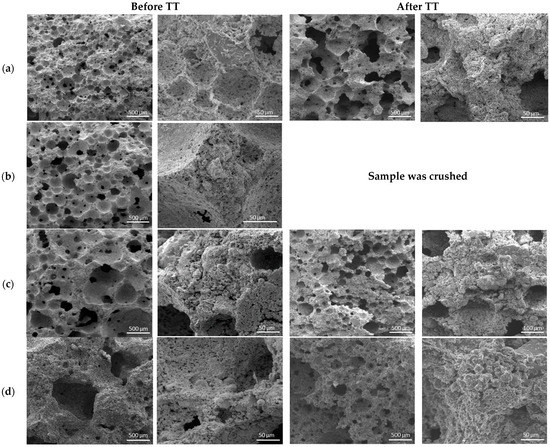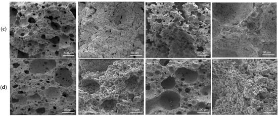 The microstructure of CGP with different compositions was studied (Figure 6 and Figure 8), as well as using two introduction methods of alkaline activator, which are freshly prepared aqueous NaOH solution (Figure 8) and 24 h “aged” aqueous NaOH solution. The microstructure of cellular geopolymers before and after high-temperature treatment at 600 °C is presented in Figure 9.