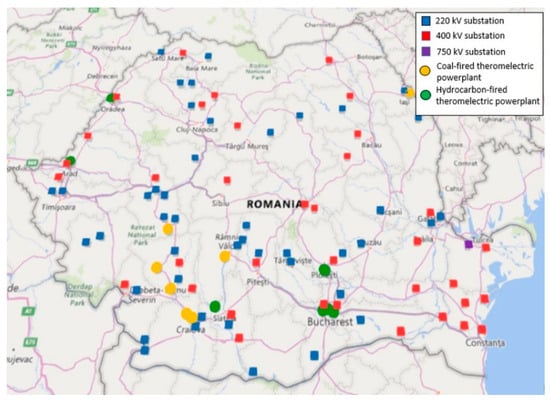 - The main substations of the electric network (220 kV, 400 kV, and 750 kV). According to the data provided by Transelectrica (the company in charge of the transport of electricity in Romania), the electricity transport network in Romania consists of one 750 kV substation (at Isaccea), 38,400 kV substations, and 42,220 kV substations. The number of 110 kV substations in the network is more than 1000 [34].