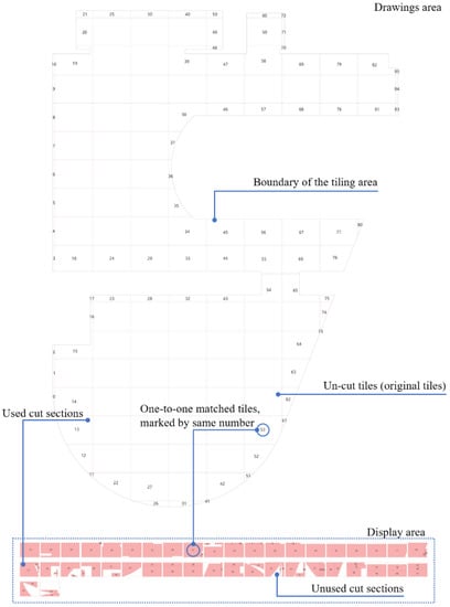- Improving the system’s adaptability to optimize the layout design of more 2-D cutting construction materials is necessary. Many other similar materials have optimization requirements in the design stage in engineering practice. Since different materials use different design and construction rules, the layout design method is challenging to combine. For example, the support force is not a significant problem when discussing the cutting and planning rules of floor tile; however, some other 2-D cutting construction materials (e.g., glass) need to consider the support force problem when reusing the cut sections. This research only considers the floor tiles design optimization; there is a strong potential for expansion and application in the AEC industry.