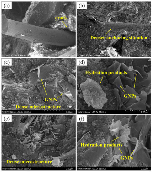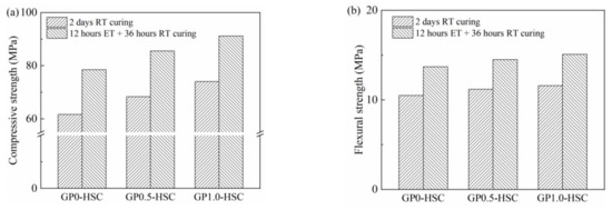 - The incorporation of GNP could effectively enhance the mechanical properties of HSC samples. In particular, the compressive strengths of the 12 h ET-cured GNP0.5-HSC and GNP1.0-HSC samples, respectively, reached up to 85.6 and 91.2 MPa with further 36 h RT curing, which are 9.0% and 16.2% higher than that of the ET-cured sample with no GNP addition. Moreover, the implementation of ET curing is also advantageous for the performance of GNP-HSC samples: with the same GNP content added, ET-cured samples possessed higher mechanical properties than RT-cured samples.