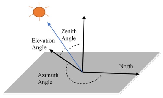 When installing the PV system over buildings’ roofs, one of the significant factors that should be considered is the sun path. The more solar panels exposed to the direct sun, the more energy is harvested. Each location in the world has a specific sun path and unique tilt, azimuth, and elevation angles []. Figure 2 represents the most significant angles that play an important role in PV system design.