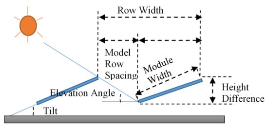 The desired tilt angle varies according to the case study under test. The designers should ensure that the solar panels face the sunlight perpendicularly, as much as possible, since the solar panels produce the highest power when they face the sun directly. During the winter semester, the solar panels face the sun at a sharp angle. Therefore, the energy produced by the PV system is low compared to the energy produced during the summer semester. In the winter semester case, the operator should ensure harvesting large amounts of solar energy by choosing proper orientation angles. The optimum tilt angle in KSA is approximately equal to the site’s latitude under test [,]. In addition, the elevation angle significantly affects the proper method of installing the panels with the most suitable spacing between rows. This must be determined to avoid the possibility of energy reduction that panels cause for each other. Figure 3 illustrates the relationship between elevation angle and spacing between rows in the PV system.