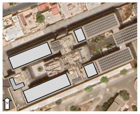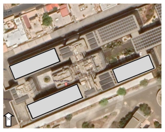 To face the problem of being forbidden to use the entire area, one possible solution is to change the tilt angle to reduce shading and accommodate the area restriction with targeted capacity. This was done by decreasing the tilt angle to 15° rather than 22°. This will reduce the distance between the PV panels to prevent shading and consequently reduce the entire area of installation. Figure 5 presents the distribution of the PV panels on the available area using the second scenario in which the tilt angle is 15°. It is clear that the PV panels are installed over two complete roofs and three separate small, distributed roofs in which the total area is less than the first scenario area.