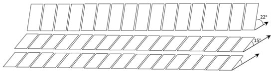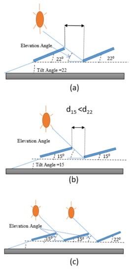 An additional solution has been suggested by the authors to accommodate the limited area of the roof buildings. The solution is based on using the optimal tilt angle of 22° for the first string of the PV system and a tilt angle of 15° for the other strings. The advantage of using this configuration is that it provides more energy than the second scenario and accommodates the limited area of the roof building without shading. Figure 6 shows the authors’ proposed configuration, which can be used over buildings’ roofs where the area is limited. Figure 7 shows the relationship between elevation angle and spacing between rows for all scenarios. It is clear that the distance between rows is increased by increasing the tilt angle. Therefore, the first scenario has the maximum spacing between rows.