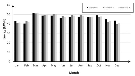 As mentioned before, the three scenarios would produce different amounts of energy even though the number of panels is the same. The energy production of the PV system varies during the year, in which the maximum energy production is in May and the lowest energy production is in December in both scenarios.
