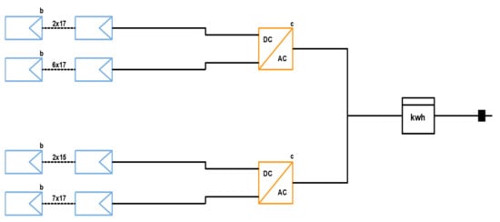 The connection diagram between the panels and the inverters is shown in Figure 8. The panels are connected in four main groups: 2 × 17, 6 × 17, 2 × 15, and 7 × 17. Each group has a specific number of strings, in which panels are connected in series.