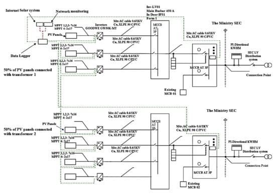 The single-line diagram (SLD), shown in Figure 10, was drawn and sized according to the Ministry of Electricity standards of grid integration for the distribution system of low and medium voltages. Moving in detail to the SLD, the number of the connected solar panels is 790 panels distributed in an area of 2118 m2. In addition, there are six inverters with a capacity of 50 kW each. The appropriate connection between these panels and inverters is to establish three groups of series panels, 15, 16, and 17, each group connected with one of the inverters’ MPPTs. This distribution is determined by the inverters’ voltage limits, which keep the voltage up to 950 volts.