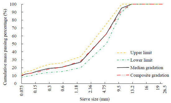 A stone mastic asphalt mixture (SMA 13) with a nominal maximum particle size of 13 mm was selected from the new construction project of the Jiangpu Road River Crossing Tunnel in Shanghai. The indexes of the modified asphalt are listed in Table 1. Additionally, the basic technical indicators of the coarse aggregates and filler are listed in Table 2 and Table 3. The primary indicators of the aggregates and filler satisfy the corresponding requirements in Technical Specifications for Construction of Highway Asphalt Pavements (JTG F40-2004) [27]. Table 4 shows the SMA 13 mixture’s production composition proportion, and the aggregate grading design is shown in Figure 1.