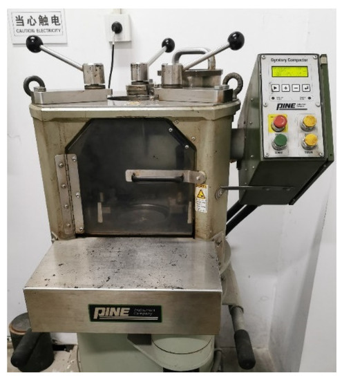 The specimens were compacted in a gyratory compactor produced by Pine Instrument Company, as shown in Figure 3. The gyratory compaction process was implemented with a stable pressure of 600 kPa, a rate of 30 gyrations per minute, an angle of 1.25°, and a total number of 100 gyrations.