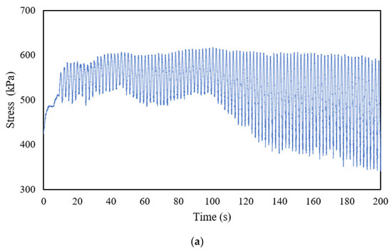 Theoretically, after a critical interlocking state of the asphalt mixture, the response value’s fluctuation should reach a plateau. Therefore, the representative stress value (Rs) is defined to describe the relative stress change range within one compaction cycle. Additionally, the representative stress value can be calculated according to Equation (3). Similarly, the representative acceleration or rotation angle value can be calculated.