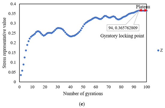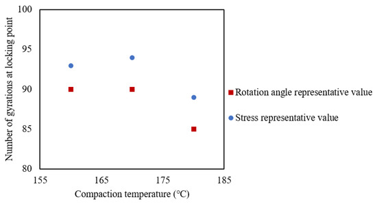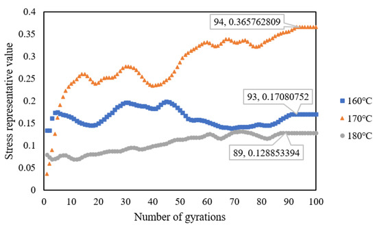 To consider the effect of the compaction temperature, representative stress values are shown in Figure 9. It can also be seen that the representative stress value experienced a rapid increase and frequent fluctuation and reached a stable plateau at a different critical point. With a compaction temperature of 180 °C, the gyratory locking point was determined at 89 gyrations. With compaction temperatures of 160 °C and 170 °C, the gyratory locking points were close at 93 and 94 gyrations. These results may indicate that the aggregates reached an interlocking state earlier with a higher compaction temperature. The time–temperature equivalent characteristics of asphalt could explain this phenomenon. The higher the temperature, the shorter the time required to reach the equal compaction state.