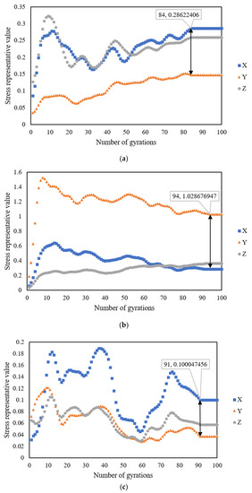 In Figure 8, the horizontal axis represents the number of gyrations, and the vertical axis is the representative triaxial stress (X-axis, Y-axis, and Z-axis) values (RS) for each gyratory compaction, indicating the relative stress change range. The SmartRocks were embedded in various positions to collect original data during gyratory compaction with a temperature of 170 °C. When the SmartRock was embedded in the specimen’s upper part, as shown in Figure 8a, the representative triaxial stress values increased significantly, reaching a peak value at approximately 9 gyrations, then fluctuating frequently before a critical point at 84 gyrations, and lastly arriving at a plateau. Similarly, when the SmartRock was embedded in the specimen’s center part, as shown in Figure 8b, or lower part, as shown in Figure 8c, the results indicate that the representative stress values showed a noticeable increase first to a peak value, then frequent fluctuations, and finally a stable state after 94 or 91 gyrations, respectively. According to the definition of the gyration locking point in this study, for the SMA 13 mixture with a compaction temperature of 170 °C, the aggregates in the upper part reached the interlocking state (84 gyrations) first, followed by those in the lower part (91 gyrations), and lastly those in the center part (94 gyrations).