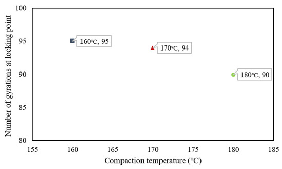 In addition, this conclusion could be verified by the results of the traditional gyratory locking point method based on the specimen’s height change in Figure 10. The horizontal axis is the compaction temperature, and the vertical axis is the number of gyrations at the locking point. This demonstrates that the specimen reached the locking point earlier at 90 gyrations with a compaction temperature of 180 °C, when the SmartRock was embedded in the specimen’s center.