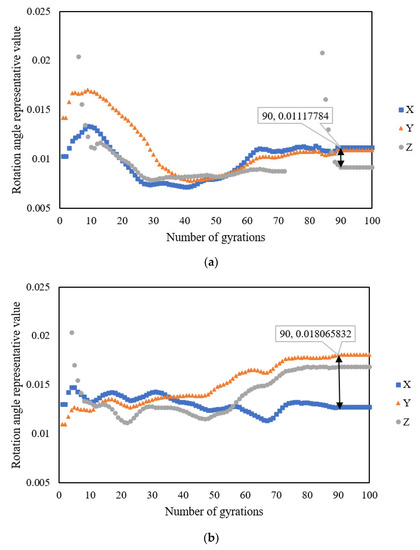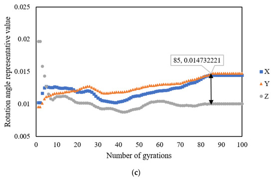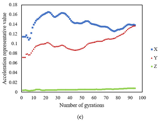 Unlike the representative stress and rotation angle values, the representative acceleration value indicates a different trend. Figure 14 shows the results for when the SmartRocks were embedded in the specimen’s center with various compaction temperatures. The representative Z-axis (vertical direction) acceleration value shows no change during gyratory compaction. The primary reason is that the gyratory compactor works with a vertical stress of 600 kPa, at a constant speed of 30 rotations per minute. In Figure 14a, the representative X-axis or Y-axis (horizontal direction) acceleration value increases first to a peak value at around 5 gyrations and then gradually reduces to reach a plateau at 91 gyrations. In Figure 14b, the representative Y-axis acceleration value mutates at around 63 gyrations; however, the representative X-axis and Z-axis acceleration values maintain a similar stable trend entirely. Unlike Figure 14a,b, Figure 14c demonstrates that the representative X-axis or Y-axis acceleration value has a different trend. Moreover, the number of gyrations obtained from the analysis result is less than 100, indicating that the data packet loss problem occurred during the original data collection. Overall, the representative acceleration value is unsuitable to be used for determining the gyratory locking point.