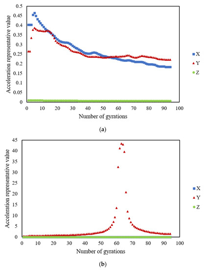 - Overall, the representative acceleration value is unsuitable for characterizing the interlocking process during gyratory compaction. Due to the gyratory compactor working at a constant speed and a specific angle, the representative horizontal direction (X-axis or Y-axis) acceleration value changes with no significant regularity. In addition, there is an original data packet loss problem during acceleration data collection, leading to incomplete acceleration peak data. A feasible way to solve this problem might be to enhance the Bluetooth transmission signal.