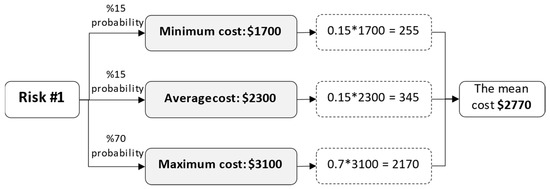 Step 3:Decision Tree Method for Average Risk Cost: The average cost of each risk is calculated after calculating the minimum, maximum, and average cost of risk. The decision tree method [27] is used to calculate the cost of each risk based on the three perspectives of optimism, pessimism, and realism, from which its probability is determined. For example, the optimistic case is the minimum cost ($1700). The realistic case is the average cost ($2300). Finally, the pessimistic case is the maximum cost ($3100). Figure 2 depicts this example of the expected risk cost for the Risk #1 project, which has a probability of 15% optimistic, 15% realistic, and 70% pessimistic, with a total cost of $2770 in the project.