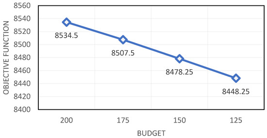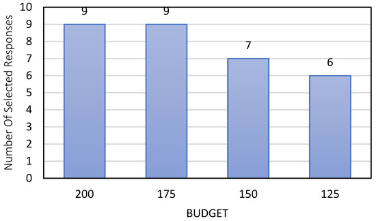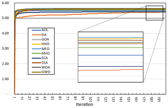 Many real-world optimization problems, particularly in the construction industry, are complex [47]. For these challenging problems, metaheuristic algorithms may be used [48]. There are some benefits to using metaheuristic algorithms [49,50]. They can be applied to any problem that can be expressed as a function optimization problem [51], are typically easier to understand and implement [52], can solve larger problems faster [53], are simple to design and implement [54], are very flexible [55,56], and can be combined with other techniques [57]. The validation procedure and comparison of algorithms to solve the case study are discussed in this section. Therefore, ten different metaheuristic are selected including The ant lion optimizer (ALO) [58], dragonfly algorithm (DA) [59], grasshopper optimization algorithm (GOA) [60], Harris hawks optimization (HHO) [61], moth-flame optimization algorithm (MFO) [62], multi-verse optimizer (MVO) [63], sine cosine algorithm (SCA) [64], salp swarm Algorithm (SSA) [65], whale optimization algorithm (WOA) [66], and grey wolf optimizer (GWO) [67]. We have tuned the algorithms’ parameters based on their main sources to have an unbiased comparison. In this regard, the maximum number of iterations is set to 200, and the number of populations is set to 100 for all metaheuristics. Each algorithm is run 60 times, and the results, including the best (B), worst (W), mean (A), and standard deviation (SD) of the answers, are recorded in Table 8. In addition, after carefully solving the problem, the value of the mean response distance of each algorithm from the best-found answer (GAP) is also given in the table. It should be noted that after solving the problem accurately and the best answers obtained from the algorithms, it was found that among the 13 existing strategies, due to the budget limitation, the company considered ten strategies, which are given in Table 9. The coefficient of the utility function (α) is also assumed to be 0.1. Finally, to select the best algorithm from the employed methods, convergence analysis (Figure 4), distance from the best answer as mean (Figure 5), and box and whisker plot (Figure 6) are presented. It is worth mentioning that because the computational time of the algorithms is very small, about 1.32 s, and on average similar, the comparison of the solving time of the algorithms has been omitted.
