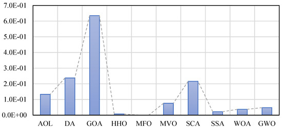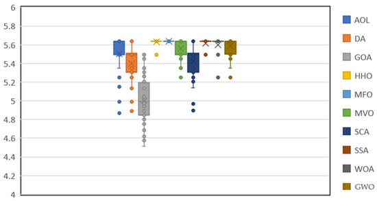 Finally, statistical analysis is used to show the accuracy of the algorithms in addition to the quality criterion. The standard deviation values of the answers in each iteration using the Box and whisker plot are used in Figure 6. The more compact and upper the bars, the more accurate the algorithm. This diagram also testifies to the greater accuracy of the metaheuristic algorithms like MFO, HHO, and SSA than other algorithms with similar accuracy.