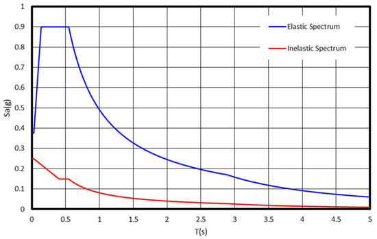 A seismic design with modal response spectrum analyses (MRSAs) of the prototype models was performed according to COVENIN 1756-1 [19]. Loads, load combinations, story drift limits, and the design spectrum were obtained from this standard. The characteristics of the models, loads, and results are described here. The MRSA is an approach commonly used in routine design. The results of an MRSA design are dependent of the response reduction factor (R), which permits to suitably scale the elastic response spectrum, obtaining the design response spectrum. In Figure 1, both spectra curves in terms of Sa/g versus T are reported, where the acceleration (Sa) was normalized by the acceleration of gravity (g) versus the period of the structure (T).