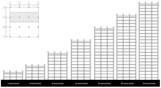 The models studied were obtained from plane frames contained in a 3D configuration. In Venezuela, the typical residential or office building configurations are concrete moment frames with 3 spans in a direction with a length of 3–6 m. In this case, the models assumed were configured from concrete moment frames with 3 spans in the longitudinal direction for 6 m and different story levels (typical story height = 3.00 m). In Figure 2, a schematic view of the plane models is shown. The concrete moment frames were modeled using the software SAP2000 v23 [25]. The members were modeled using frame elements with two end nodes and six degrees of freedom per node. The base connections were idealized as fully restrained base columns and the loads distributed along of beam elements. The second-order effects were considered with P-delta plus large displacements analysis, introducing a previous nonlinear case. All load cases were analyzed from this P-delta case. A concrete compressive strength of 25 MPa with a Young’s modulus of E = 24,000 MPa and a grade 60 steel reinforcement with E = 200,000 MPa were assumed in all numerical models.