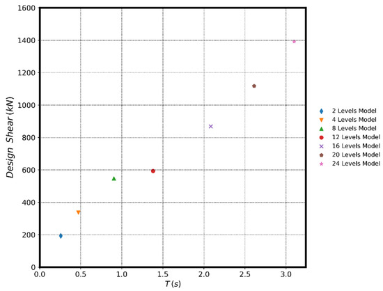 Furthermore, the design shear–period relationship for the models is shown in Figure 3. In this figure, a linear relationship of 0.1 s/level (approximately) was obtained. These values are similar to the relationships mentioned by ASCE 41 [23] in concrete frame buildings.