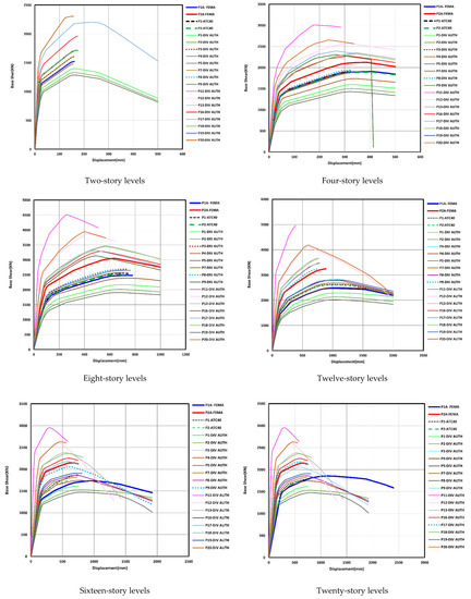 The capacity curves from nonlinear static analysis are shown in Figure 5. The load patterns. P3 and P8, reached good adjustments in two-story CMF models, similar to the results obtained in [22] and the typical FEMA-356 and ATC-40 load patterns. Similar behaviors were obtained for the load patterns, P3 and P8, which reached good adjustments in four-story and eight-story CMF models, validated in [22]. This performance was similar to the typical FEMA-356 (except the uniform load pattern in both cases) and ATC-40 load patterns. These patterns are recommended in pushover analysis of low-rise buildings.