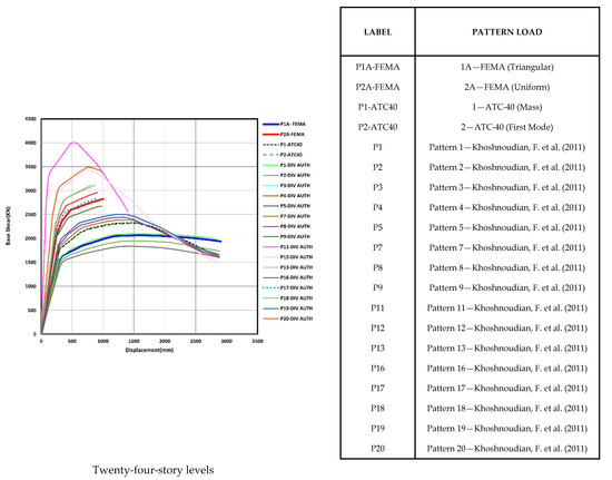 Furthermore, the load pattern, P9, reached good adjustments in the 12 story and 16 story CMF models, similar to the results obtained in [22] and the typical FEMA-356 and ATC-40 load patterns. The performance was similar to the typical FEMA-356 (except the triangular load pattern) and ATC-40 load patterns. These patterns are recommended in pushover analysis of low-rise and mid-rise buildings. Finally, a higher elastic behavior was obtained for the P17 load patterns in the 20 story and 24 story models, allowing to attain similar behaviors as the triangular FEMA load pattern.