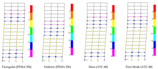 In general, the beam hinges and ductile mechanisms were obtained in the models with 2, 4, 8, and 12 story levels subjected to the load patterns of FEMA 356 and ATC-40. Similar results were developed in the patterns 1–2–3–4–5–7–8, according to [22]. In high-rise models, a combined mechanism was obtained.