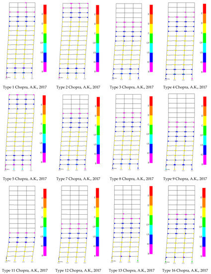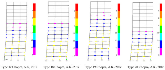 Furthermore, the failure mechanisms in the models (uniquely for 16 story levels, because of the big number of data) according to the load patterns are shown in Figure 6. As shown in Figure 6, different failure mechanisms were obtained. In this sense, three failure mechanisms could be obtained: ductile, brittle, and combined failure mechanisms. The ductile failure mechanism was derived from plastic hinges in the beams. The brittle failure mechanism was represented by plastic hinges in the columns, and the combined failure mechanism was the combination between both failure mechanisms, but with hinges in the base of the columns. In the 16 story models, failure mechanisms without a clear trend were obtained. However, the failure mechanisms of the P9 load patterns were similar to the FEMA-365 uniform load pattern model, which is consistent with that mentioned above. Additionally, excessive ductile behavior was reached by the models with the P1(P1A)–P2–P5 load patterns, but this behavior was not completely representative of the real performance of CMF buildings [22]. Column hinges in models with 2, 4, 8, and 12 story levels were obtained uniquely for the load patterns 11 and 20, evidencing a non-desirable failure mechanism. The models that had 16, 20, and 24 story levels that were subjected to load patterns 11–12–13–17–18–20 developed column hinges.
