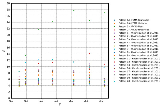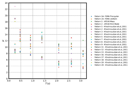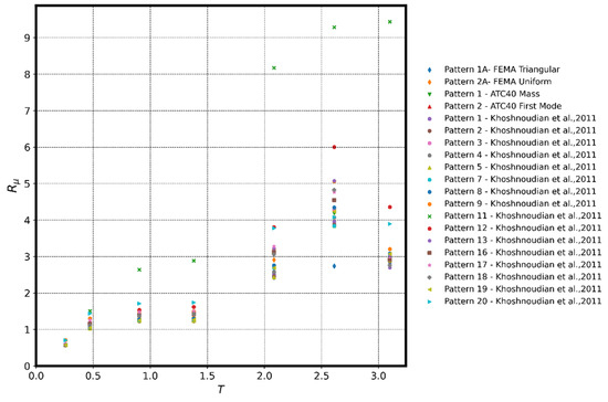 Figure 7. Ductility reduction factor versus period for different patterns.