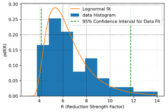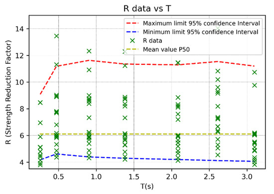In Figure 11, a statistical fit was performed for the R values obtained. The R values were adjusted to a log-normal distribution, showing a 95% confidence interval when the R values were adjusted to R = 4. This adjustment reached a lower value in comparison to the value for R = 6 established in the Venezuelan standard for concrete moment frames. The value of R = 6 was adjusted to a confidence interval in order to 50% as shown in Figure 12.