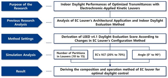 Analysis can be used to derive physical EC louver’s width for optimal daylight control. In addition, data of the indoor daylight environment for each of the louver’s VLT and angle were derived. In conclusion, it is possible to establish the basis for the operation method of the shell to reduce the indoor light environment of the EC louver, which is the purpose of this study. The flow of the study is shown in Figure 1.